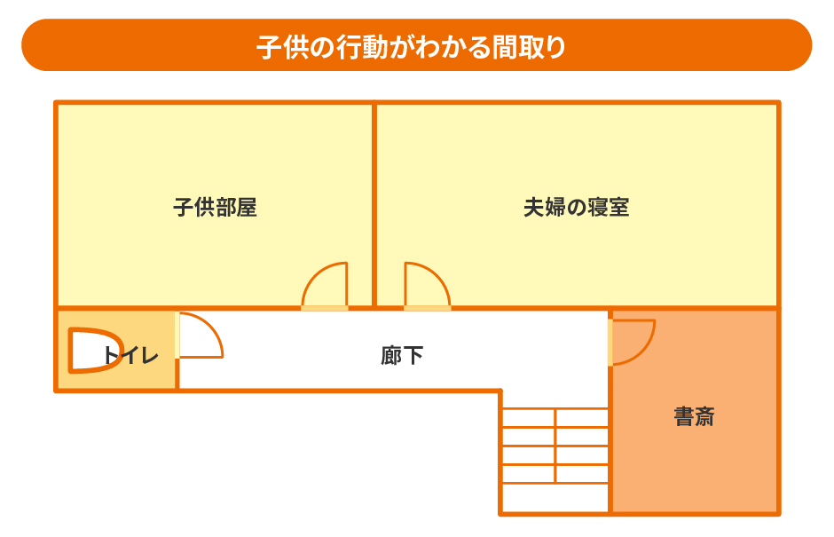 子供部屋に行くまでに夫婦の寝室の前を通るようにするなど、子供の行動がわかる間取りにすることで、家族間のコミュニケーションが向上。