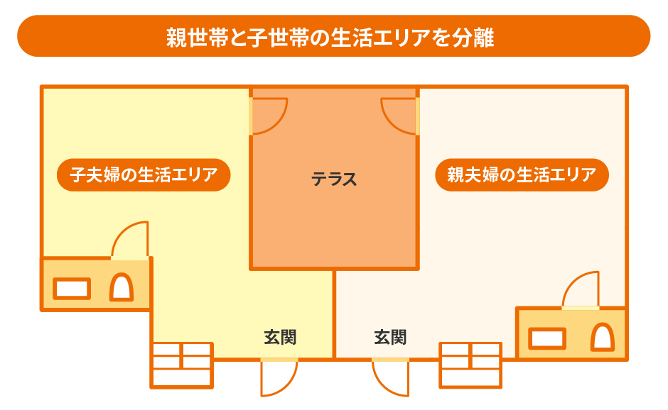 親世帯・子世帯の水場を近い位置にまとめたり、寝室やリビングの位置を考慮するなどの対策を取ることで、双方が快適な生活に。