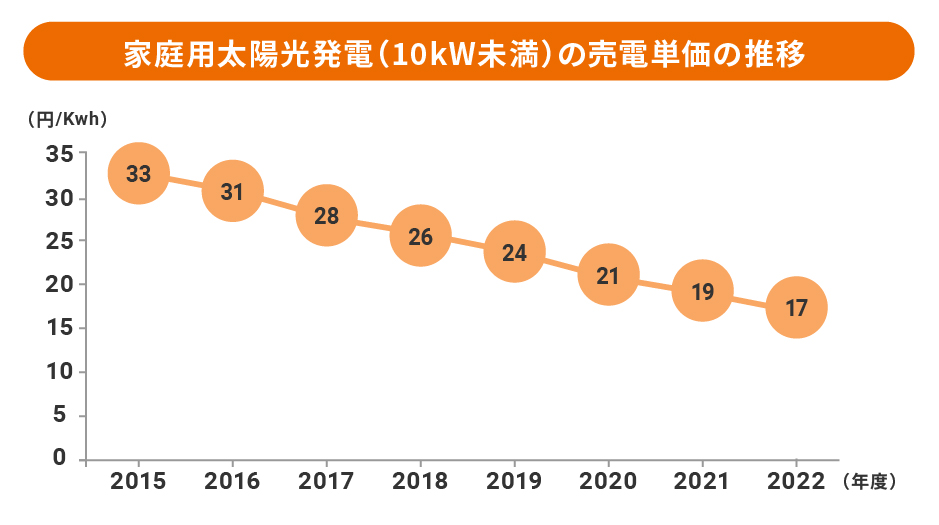 次の図は太陽光発電の売電価格の推移です。家庭用太陽光発電(10kW未満)の売電単価は年々下落し、2019年度は1kWhあたり24円。2022年度は1kWhあたり17円となっています。