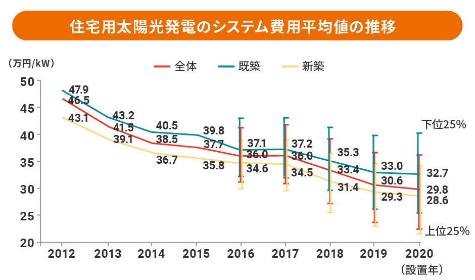 次のグラフは、太陽光発電設備の導入にかかる費用の推移を示しています。