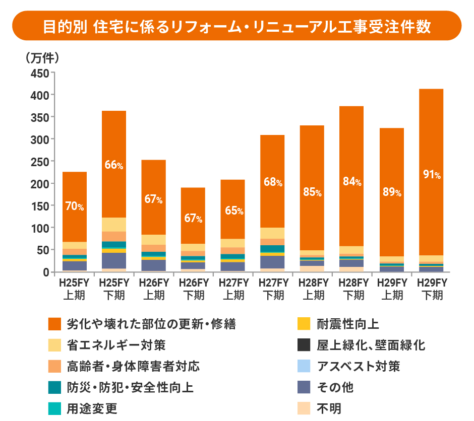 このレポートによると、「劣化や壊れた部位の更新・修繕」といった小規模なリフォームが過半数を占めました。