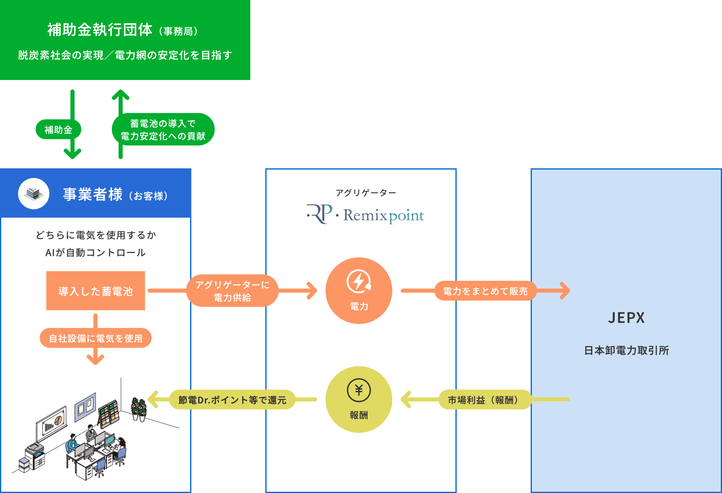 DR(デマンドレスポンス)補助金とは、国が電力の需給バランスを維持するために、法人の蓄電池導入を支援する制度です。電力不足が懸念される際に電気の使用を制御する「DR」への協力を条件に、導入費用の1/3を補助する枠組みが用意されています。本事業は、指定のDRメニューを提供する小売電気事業者の介在が必要となります。当社は数少ない登録事業者の1社として、補助金の活用検討から運用フェーズまでを一貫してサポートしています 。